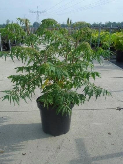 Rhus typhina ‘Dissecta’ (Laciniata) is een brede heester, die tot 30o cm hoog wordt.