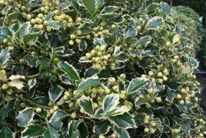Ilex aquifolium ´Argentea Marginata´ is een hulst met egaal witte randen op de bladeren. Deze Hulst draagt tevens een overvloed aan bessen.