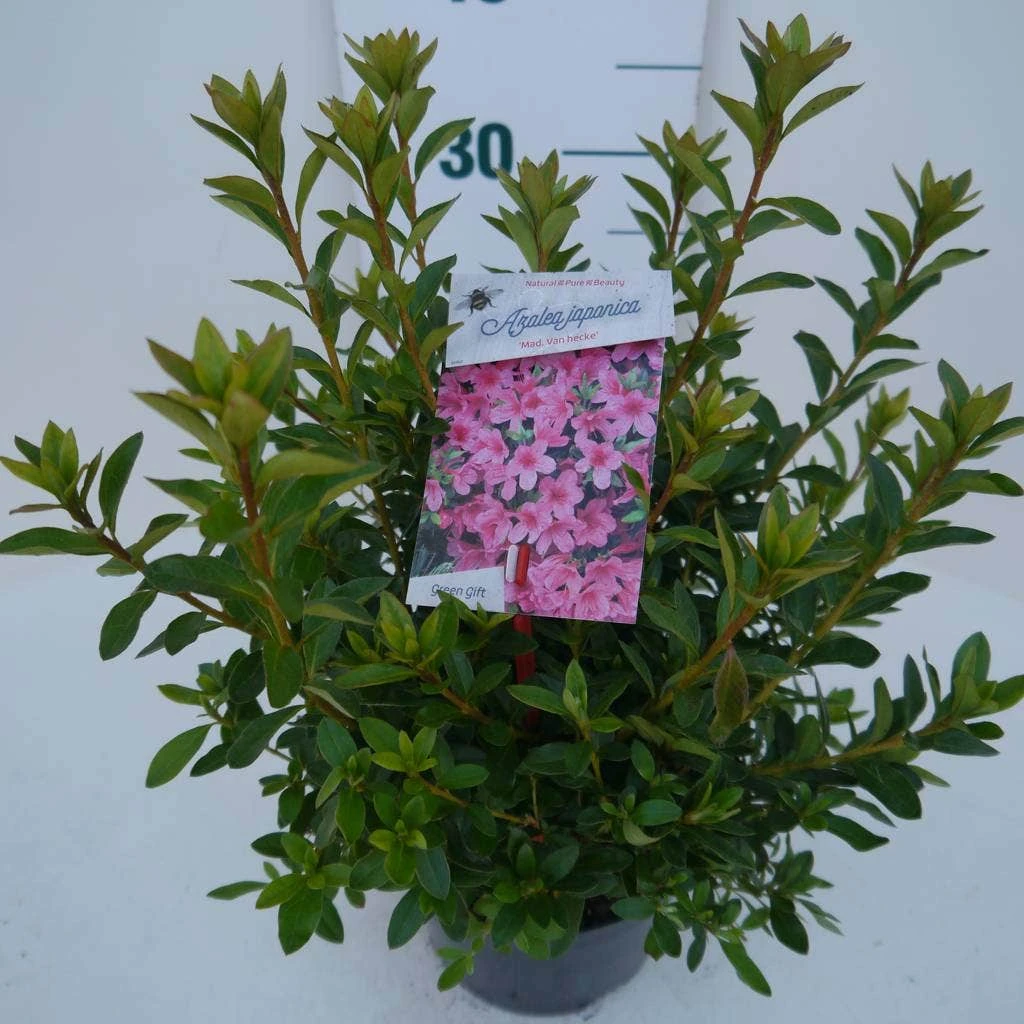 Rhododendron ‘Madame van Hecke’ is een Japanse Azalea met helderroze bloemen.