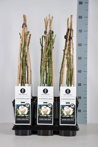 Rosa ‘Schneewalzer’ (klimroos wit) is een doorbloeiende klimroos met hele mooie grote bloemen en zeer gezond blad. De geurende, witte bloemen worden ongeveer 14cm in doorsnede. Deze roos wordt ongeveer 250cm hoog en ongeveer 100cm breed en wordt geleverd in vierkante pot met een inhoud van 3 liter en 3 stokken. Zeer winterhard.