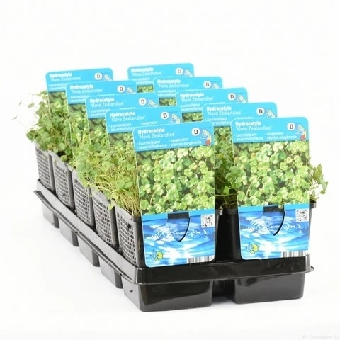 Hydrocotyle novae-zelandiae (waternavel) is een moerasplant die ook geschikt is voor in de vijver. Op het water worden als het ware matten gevormd van de blaadjes.